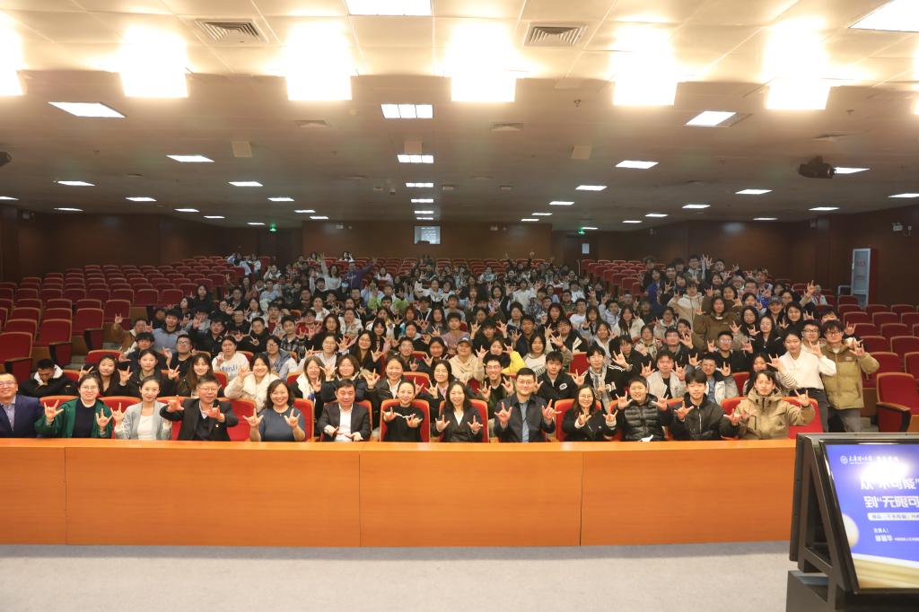 報(bào)告會(huì)前,葉寧為邰麗華頒發(fā)了聘書(shū)。邰麗華帶領(lǐng)大家回顧了中國(guó)殘疾人藝術(shù)團(tuán)成立38年來(lái)的發(fā)展歷程。她表示,從最初的僅有幾名成員,到如今登上聯(lián)合國(guó)總部、北京奧運(yùn)會(huì)、央視春晚等國(guó)際舞臺(tái)的“特殊藝術(shù)名片”,藝術(shù)團(tuán)始終以“展現(xiàn)生命的尊嚴(yán)與價(jià)值”為使命。她特別提到舞蹈《千手觀音》的創(chuàng)作故事。21名聽(tīng)障演員通過(guò)手語(yǔ)老師的指揮和地面的振動(dòng)感知節(jié)奏,以千余次排練達(dá)成精準(zhǔn)配合,最終在2005年春晚驚艷世界。她還分享了人工智能技術(shù)如何推動(dòng)藝術(shù)普及與無(wú)障礙傳播。作為顧問(wèn),她與團(tuán)隊(duì)一起讓今年蛇年春晚的無(wú)障礙轉(zhuǎn)播覆蓋全國(guó)31個(gè)省份,為藝術(shù)插上翅膀,讓更多“不可能”成為可能,引發(fā)廣大師生共鳴。