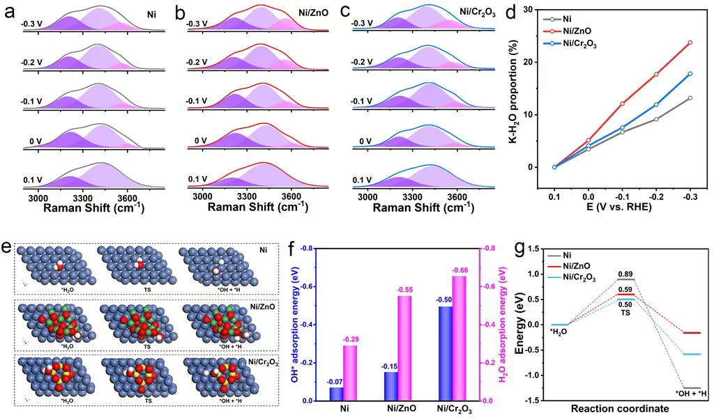 為進一步驗證Ni/ZnO催化劑因具有最佳*OH結合能力而提升的HER動力學過程,研究通過原位光譜表征和DFT計算進行了深入分析。原位拉曼光譜顯示,Ni/ZnO表現出更高的K·H2O比例,表明其誘導了更有序的界面水結構。DFT計算表明,Ni/ZnO由于具有適中的*OH吸附能力,不僅能夠促進水的解離過程,同時能夠避免太強的*OH吸附(例如,Ni/Cr2O3催化劑)導致其難以脫附。這些結果與火山圖趨勢一致,證明了Ni/ZnO因具有適中的*OH結合能力,平衡了水解離和*OH脫附,實現了最佳HER活性。