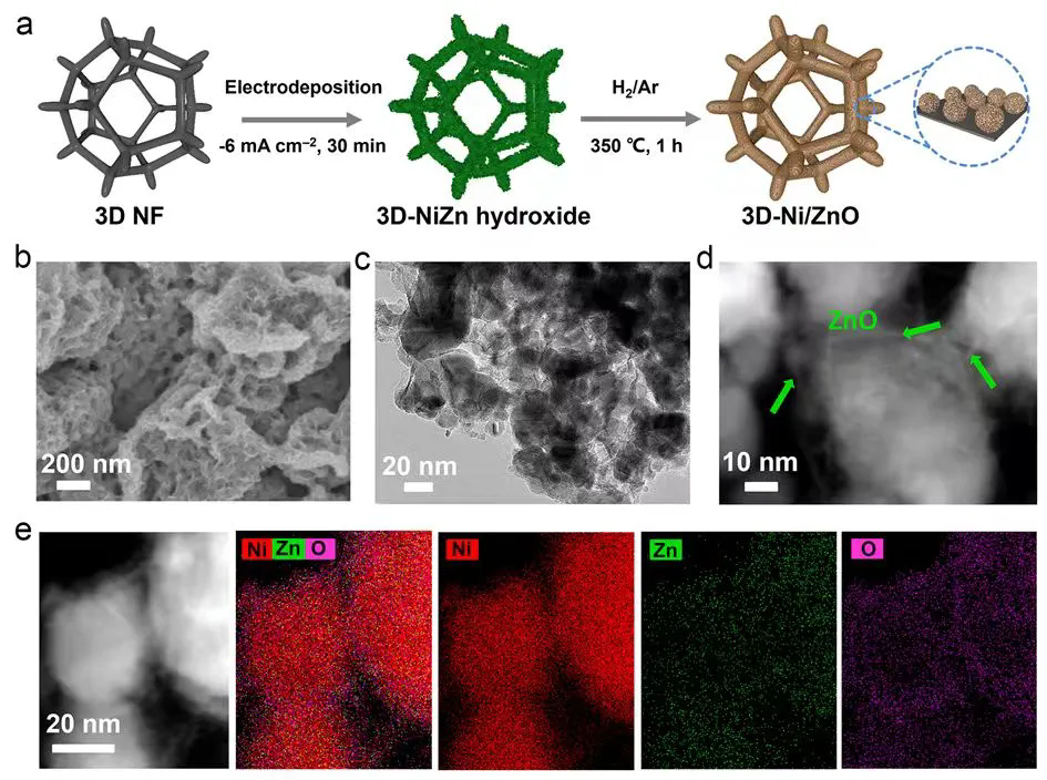 基于Ni/ZnO最佳的活性組成,進一步通過原位電沉積方法,在三維泡沫鎳基底上構建了Ni/ZnO異質結構催化劑(3D-Ni/ZnO),以暴露更多活性位點并提升HER性能。電鏡表征顯示,Ni/ZnO均勻負載在泡沫鎳骨架上,同時Ni納米顆粒被超薄ZnO納米片所包覆。此外,這一制備方法簡單、易于操作,可實現催化劑電極的大面積制備。