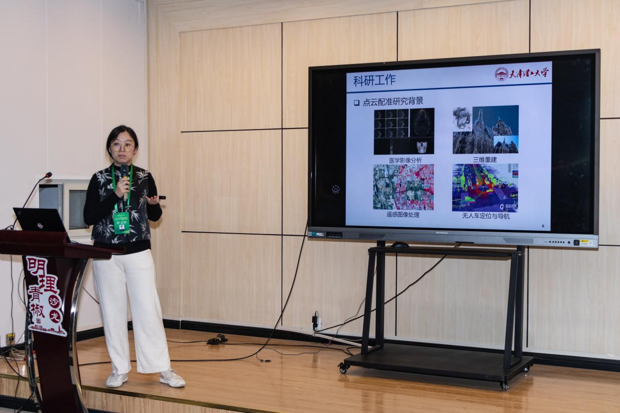 崔文婷作題為“基于RGB-D特征匹配的點云配準方法”的報告。她介紹了點云配準算法的改進與應用,并探究了未來的發展方向和交叉學科的結合。