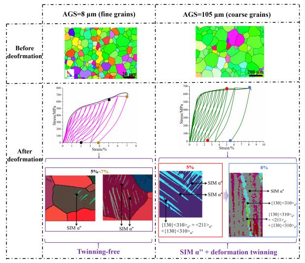 通過晶粒細化策略可有效提高亞穩(wěn)β鈦合金超彈性能,這一觀點在學術(shù)界已得到普遍共識,但一直尚未澄清晶粒尺寸對超彈合金變形機制的影響規(guī)律。高敬鈞以自主研發(fā)的Ti-20Zr-12Nb-2Sn (at.%)合金為模板,利用電子背散射衍射儀、透射電鏡、同步輻射等材料表征技術(shù)首次證實晶粒細化能有效抑制變形孿晶的激活,從而獲得最大馬氏體相變應(yīng)變。