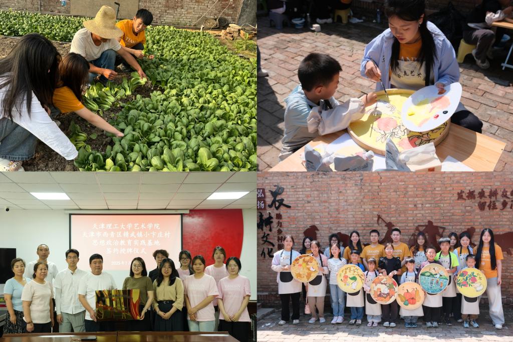 實踐團走進西青區小卞莊村,追溯村莊發展脈絡,深入田間了解農作物種植銷售情況,借助專業所長拍攝助農短視頻,為鄉村經濟發展賦能。帶領村內兒童共同繪制二十四節氣主題的非遺簸箕畫,講述農耕故事與非遺文化,作品被懸掛于村史館中,為鄉村文化繁榮添彩。學院與小卞莊村簽訂思想政治教育實踐基地共建協議并舉辦授牌儀式,以藝術為筆續寫助農興鄉新篇章。