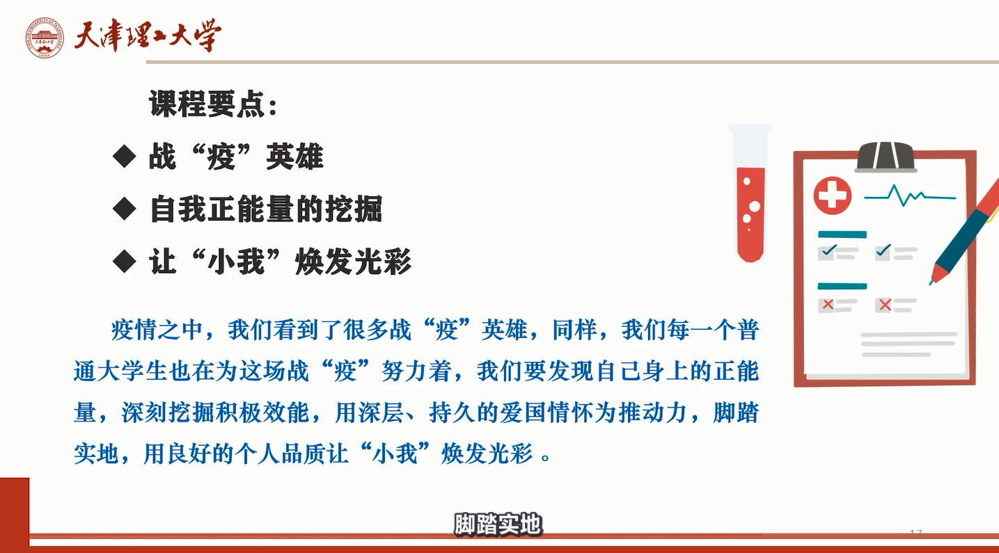 抗擊新冠肺炎疫情以來,校黨委學工部充分利用“互聯網+”思政工作新平臺打通思政教育“微通道”,精心設計、制作16期“‘共抗疫情、愛國力行’輔導員思政微課堂”,并在“天津理工大學”和“天理學工”微信公眾平臺以專欄的形式陸續推出。輔導員林健積極響應學校號召,參與錄制完成“共抗疫情、愛國力行”輔導員思政微課堂之《“疫”情中的“大我”與“小我”》。林健以《“疫”情中的“大我”與“小我”》為題,立足疫情期間大學生學習和生活客觀實際,從認知層面、情緒層面、意志行為層面三個視角構思,依據大學生愛國實踐中的問題導向,以學生個人成長為切入點,結合新冠肺炎疫情防控工作中的鮮活事例,教育引導學生把“小我”融于“大我”。