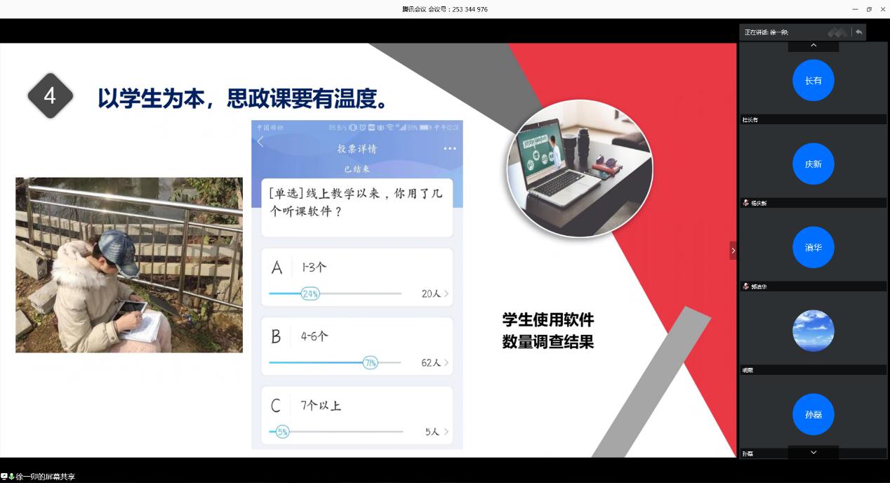 會上,程婧、熊雙風、徐一卯、王青山、晉利珍等五名教師結合各自線上教學經驗分享了教學體會。