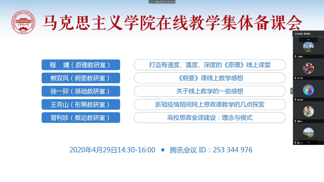 此次集體備課會是在新冠肺炎疫情的特殊背景下召開的,學院以線上的方式組織集體備課會進行經驗分享,素材積累,將進一步推動思政課教學改革創新和教學質量提升,為建設思政課“金課”和“智慧課堂”提供了寶貴經驗。