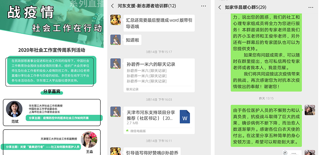 社會發展學院社會工作系的師生志愿服務團隊由社會工作專業部分教師及碩士研究生(MSW)組成,共計12人,主要負責心理與情緒舒緩、家庭關系構建、與隔離居民的溝通并協助舒緩其壓力等方面方法和技巧的整理、推送,第一時間通過微信群為一線醫護人員提供心理支援服務,服務的人群主要包括10個留觀點的醫護人員和社區書記們,共計120余人。部分老師通過熱線電話,面向全市的醫護人員和社區工作人員、居民等提供電話咨詢服務。