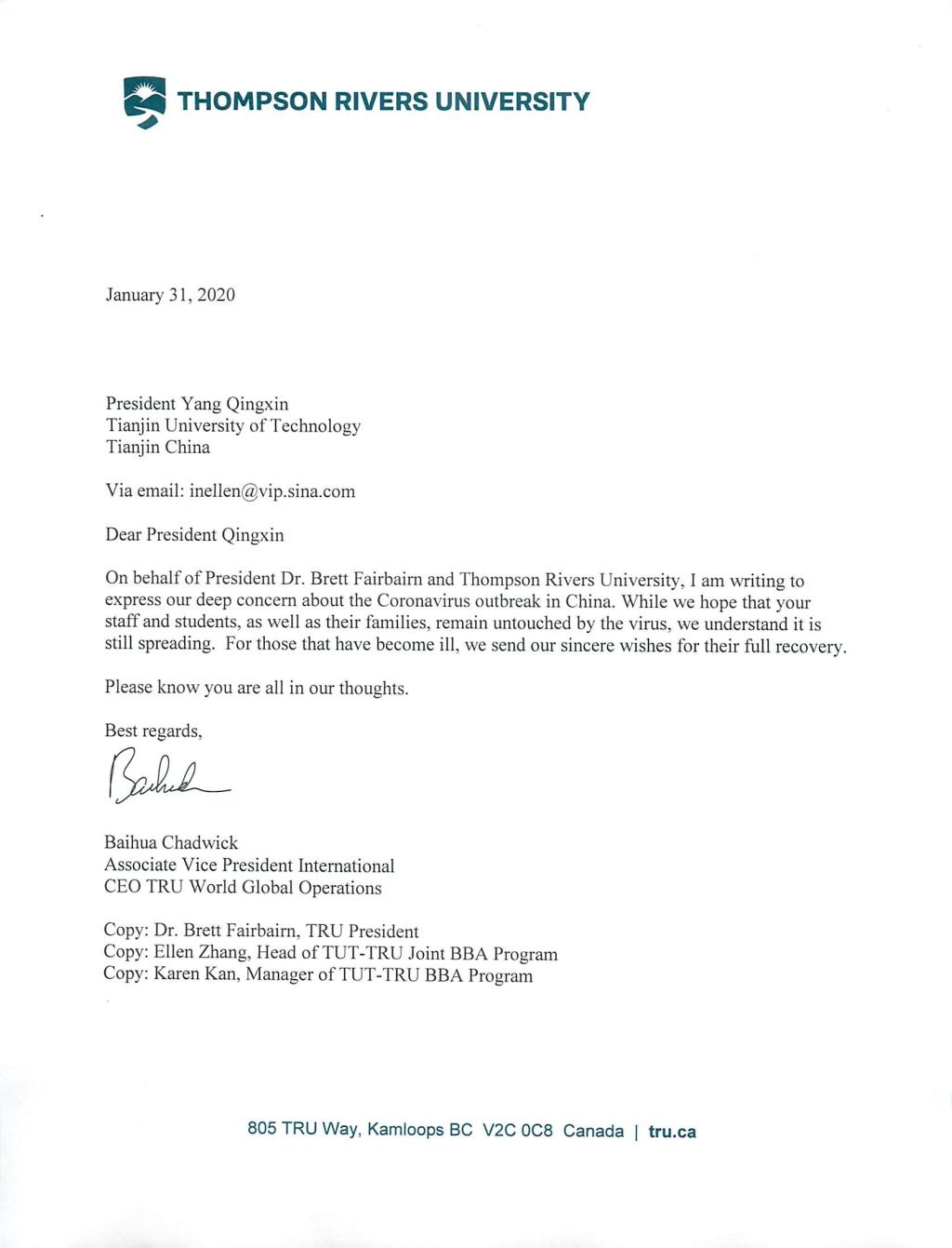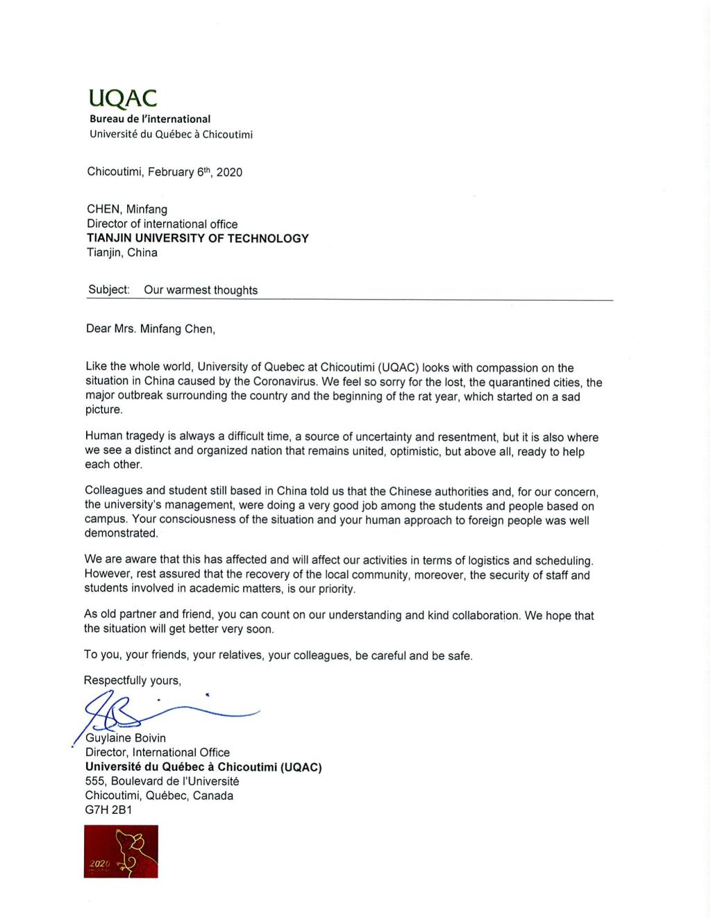 近期的新冠肺炎疫情,牽動(dòng)了我校海外友好學(xué)校、友好人士的關(guān)切。連日來(lái),加拿大湯姆遜大學(xué)、加拿大魁北克大學(xué)席庫(kù)提米分校、馬來(lái)西亞英迪國(guó)際大學(xué)等海外友好合作院校紛紛通過(guò)郵件、微信等形式與我校取得聯(lián)系,高度評(píng)價(jià)我國(guó)對(duì)抗擊疫情采取的強(qiáng)有力措施,向我校師生和全國(guó)人民送來(lái)祝福和鼓勵(lì)。