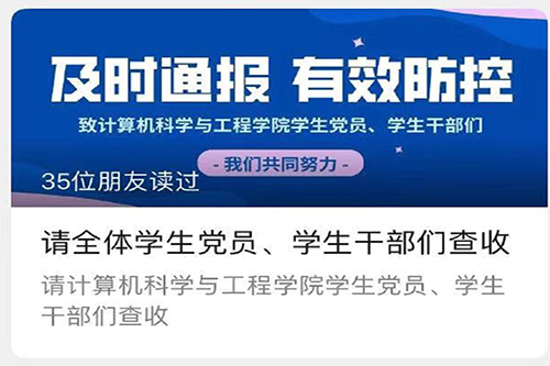 計算機科學與工程學院號召廣大學生黨員和學生干部肩負起時代賦予的使命與責任,與祖國同呼吸共命運,做好本職工作、共同戰“疫”,為奪取抗擊疫情斗爭的勝利作出應有的貢獻。