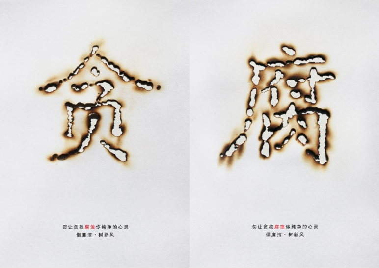 學院學生陳家柳創作了作品《腐蝕》,通過在紙上運用燙燒的手法,燒出“貪”和“腐”兩個字,來警示貪念和腐敗行為會腐蝕人們的心靈。