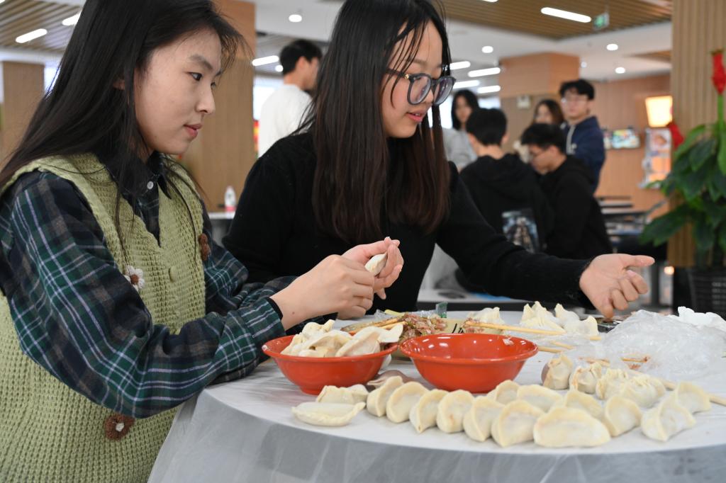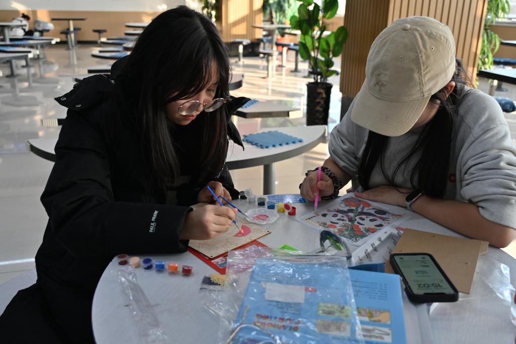 活動現(xiàn)場,同學(xué)們紛紛挽起袖子,投入到熱鬧的活動中。從揉面、搟皮到調(diào)餡、包餃子,每一個環(huán)節(jié)都充滿了歡聲笑語。大家分工合作,互相幫助,不僅鍛煉了動手能力,還加深了彼此之間的友誼。學(xué)院還精心準(zhǔn)備了剪紙、臉譜畫、掐絲琺瑯、手工拓印、扭扭棒、鉆石畫等手工作品,引領(lǐng)學(xué)生感悟匠心傳承,在緩解壓力的同時(shí),讓中華優(yōu)秀傳統(tǒng)文化浸潤健康心靈。