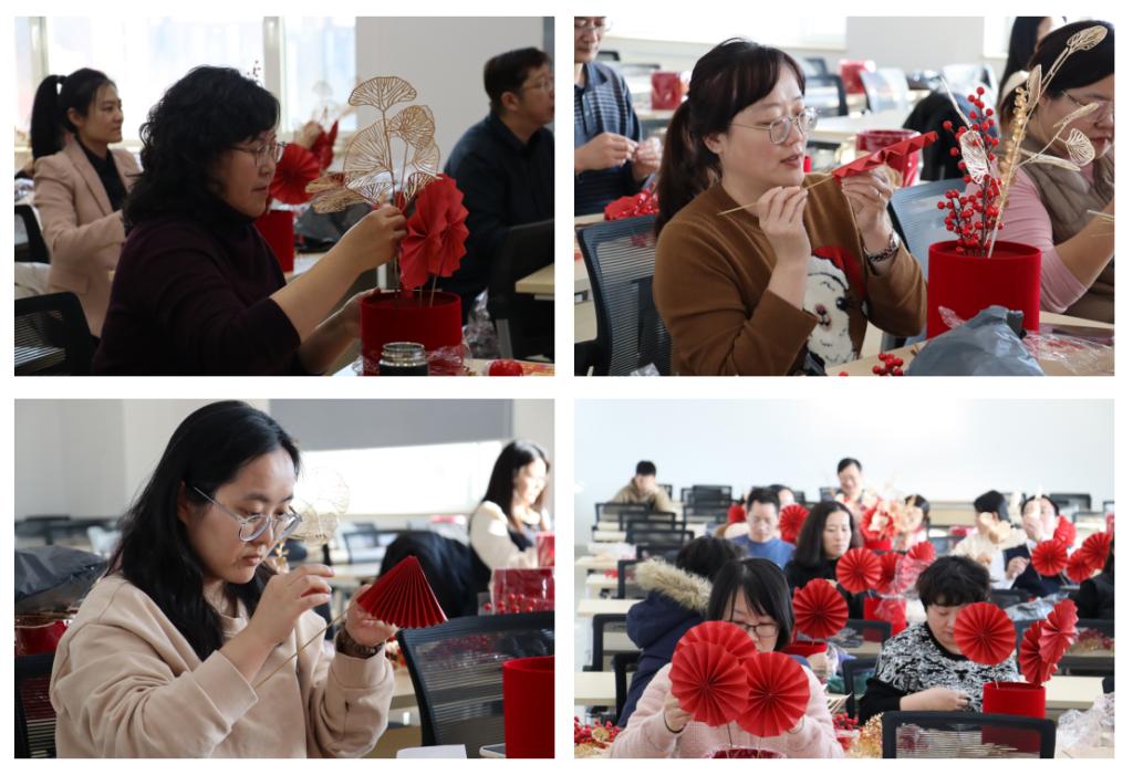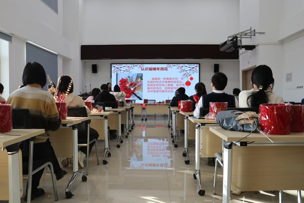 活動(dòng)現(xiàn)場(chǎng),教師們相互交流技巧,構(gòu)思造型,根據(jù)自身喜好進(jìn)行裁剪、搭配,為福桶掛上中國(guó)元素的配飾,再插上小掛件進(jìn)行點(diǎn)綴。在裝飾高低錯(cuò)落的點(diǎn)綴其間,一盆盆金燦燦、紅彤彤的迎新福桶展現(xiàn)在大家的面前。