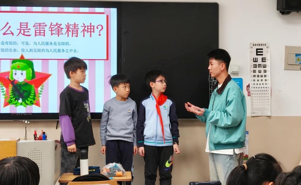在互動交流環節,宣講團成員們與小學生們展開了熱烈討論。面對孩子們提出的一個個問題,成員們耐心解答,并結合自身參與志愿服務活動的經歷,引導孩子們感悟雷鋒精神,從小樹立遠大理想,刻苦學習知識,努力成長為對社會有用的人才。