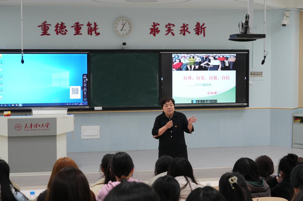 會上,天津市教育系統“夕陽紅”報告團成員、天津理工大學關心下一代工作委員會副主任馬紅健以《自尊、自愛、自信、自強》為題進行分享。馬紅健圍繞學習、生活、情感、職業規劃等多個方面,以具體事例為基點,為女性的成長提供方向與建議,并囑咐大家要牢記自己是人生的第一責任人,做任何決定之前都要獨立思考、謹慎行動、避免盲從。學院機器人系教師王珊圍繞家庭生活、學習經歷、科研思路等方面分享了自己的感悟,鼓勵女生要學會自我肯定,善于溝通交流、勞逸結合,追尋屬于自己的光。輔導員王秀丹從自己面試經歷出發,向同學們介紹了自己的求學歷程,希望大家放下焦慮,打好基礎,為日后的選擇做好準備。