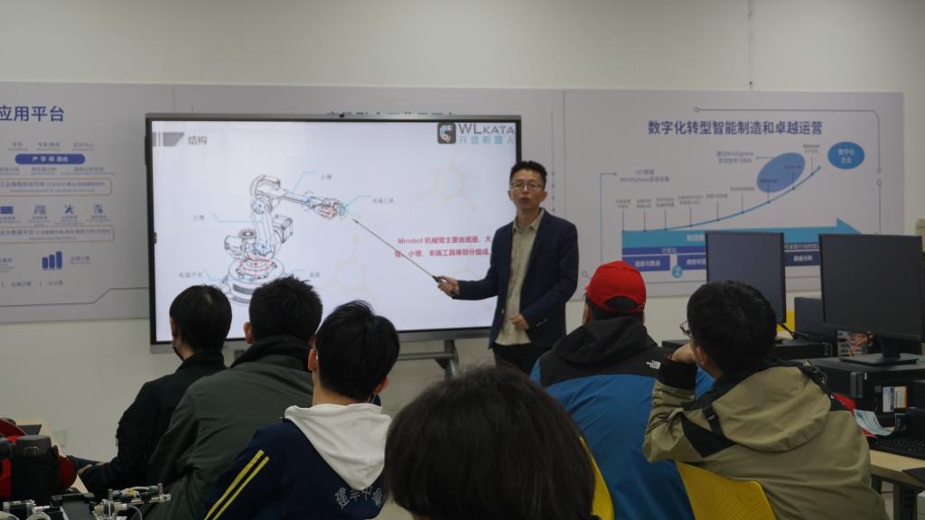 在“智造新視界”主題展廳,工程訓(xùn)練中心的導(dǎo)師團(tuán)隊(duì)帶領(lǐng)學(xué)生們開(kāi)啟了一場(chǎng)特殊“旅程”。學(xué)生們直觀見(jiàn)證物聯(lián)網(wǎng)技術(shù)如何串聯(lián)起產(chǎn)品設(shè)計(jì)、生產(chǎn)、物流全鏈條——智能機(jī)器人精準(zhǔn)抓取物料,AGV小車(chē)穿梭運(yùn)輸,云端數(shù)據(jù)實(shí)時(shí)跳動(dòng)。