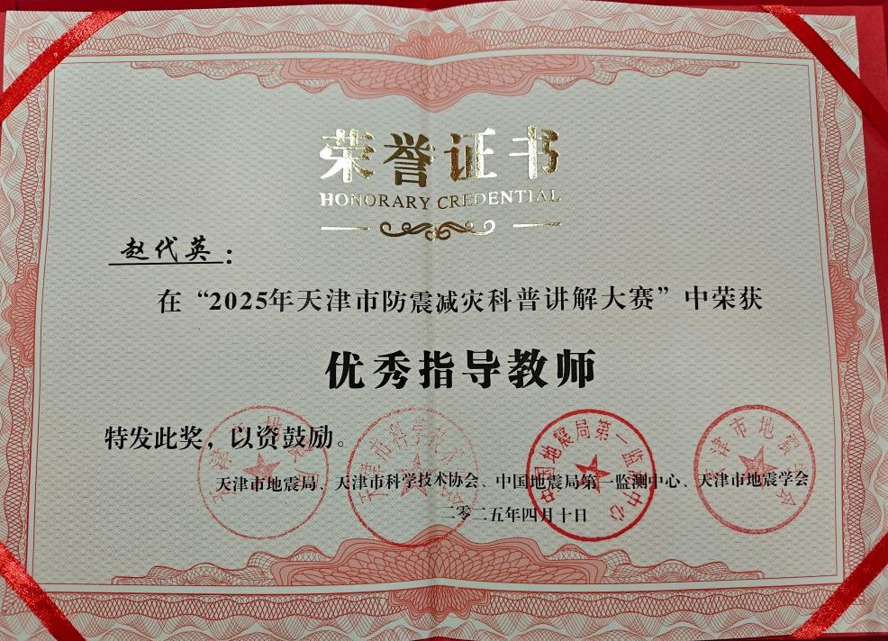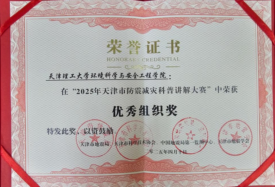 近日,2025年天津市防震減災(zāi)科普講解大賽暨第九屆全國防震減災(zāi)科普講解大賽選拔賽結(jié)果公布。環(huán)境科學與安全工程學院獲優(yōu)秀組織獎、作品《地震次生災(zāi)害:危化品的泄漏與應(yīng)對》獲優(yōu)秀獎、教師趙代英榮獲優(yōu)秀指導教師。