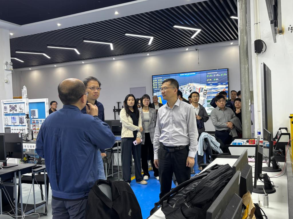 在天津工業(yè)大學工程教學實習訓練中心智能制造產(chǎn)線區(qū)域,工程訓練中心調(diào)研團隊實地參觀了先進的自動化生產(chǎn)線、工業(yè)機器人工作站以及數(shù)字化管理系統(tǒng)。天津工業(yè)大學工程教學實習訓練中心負責人詳細介紹了智能制造產(chǎn)線的建設(shè)規(guī)劃、設(shè)備選型、技術(shù)集成以及在人才培養(yǎng)中的應用情況。雙方就如何將智能制造技術(shù)與工程實踐教學深度融合,提升學生的工程實踐能力和創(chuàng)新思維進行了深入探討。