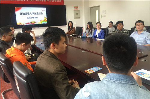為有力推動(dòng)我校大學(xué)生征兵工作的發(fā)展,充分發(fā)揮退伍軍人的模范引領(lǐng)作用,更好地在大學(xué)生群體中傳播家國(guó)責(zé)任感,4月26日,機(jī)械工程學(xué)院在15-303召開(kāi)在校退役大學(xué)生座談會(huì)。輔導(dǎo)員、退役在校大學(xué)生參加了此次座談會(huì)。