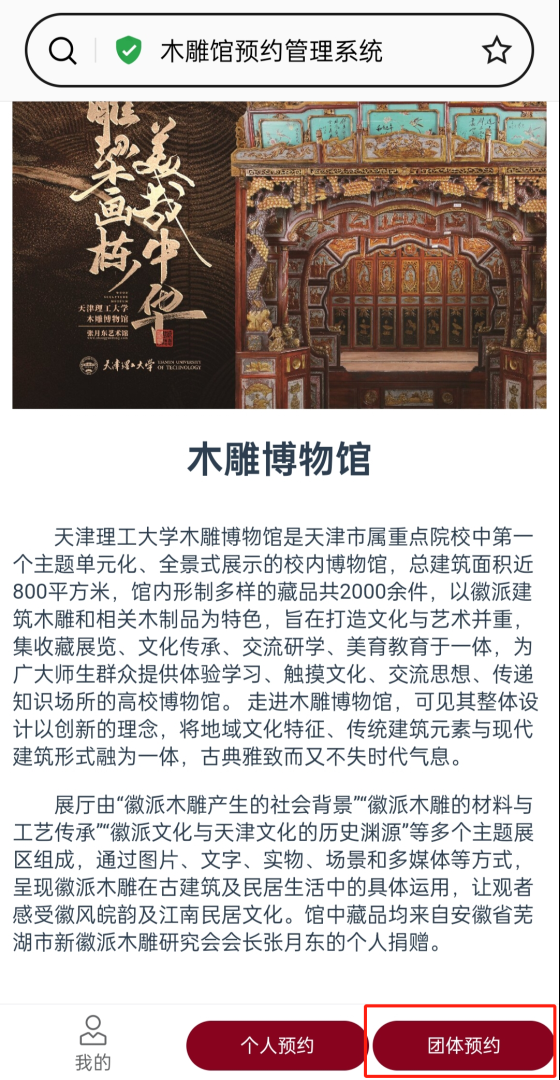 為進一步滿足全校師生多元化參觀實踐、研學互動、文化交流等需求,優化校園文化服務,黨委辦公室(校長辦公室)與藝術學院結合學校實際,聯合打造天津理工大學木雕博物館OA預約平臺,預約平臺于2024年5月30日開放使用,預約說明如下: