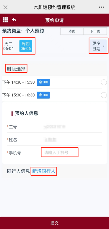 2.點擊“更多日期”選擇參觀日期及時段并填寫信息,提交預約,審核完成后即預約成功。