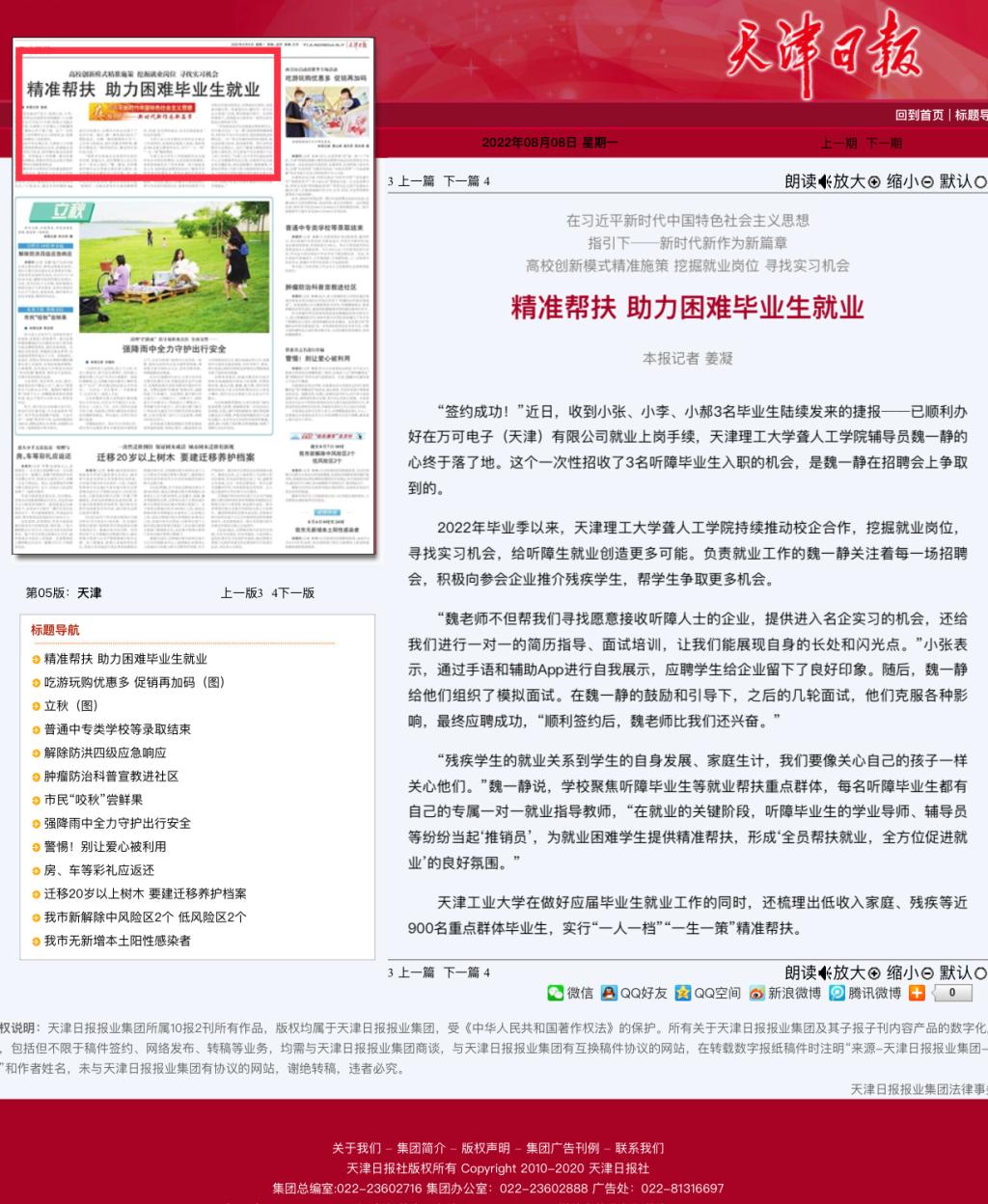 日前,《天津日報》、津云以“精準幫扶 助力困難畢業(yè)生就業(yè)”為題,報道我校聾人工學院創(chuàng)新模式精準施策,持續(xù)推動校企合作,挖掘就業(yè)崗位,尋找實習機會,給聽障生就業(yè)創(chuàng)造更多可能的經(jīng)驗做法,內(nèi)容如下: