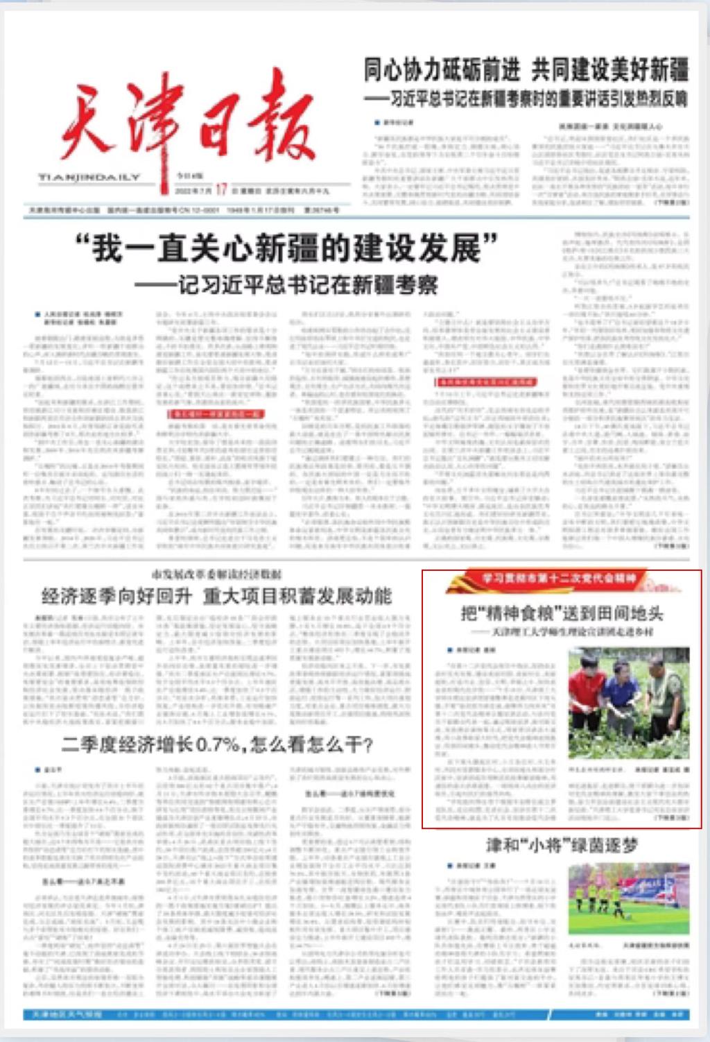 “市第十二次黨代會報告中指出,堅持農業農村優先發展,建設美麗田園、美麗村莊、美麗庭院,打造興業、宜居、文明、幸福之鄉,加快農業農村現代化步伐……”7月15日,天津理工大學師生理論宣講團冒著酷暑走進薊州區下窩頭鎮,開展“奮進擔當鑄忠誠,凝聚偉力向未來”市第十二次黨代會精神主題宣講活動,與農村黨員干部群眾代表一起,通過現場宣講、面對面交流、發放理論讀物等方式,用家常話講活大道理,用小故事彰顯大時代,把黨代會精神送到基層、傳到田間地頭,推動黨代會精神進入尋常百姓家。