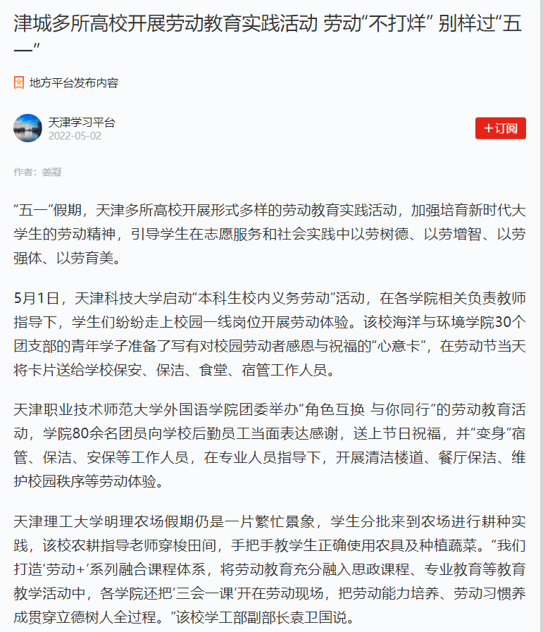“五一”假期,天津多所高校開展形式多樣的勞動(dòng)教育實(shí)踐活動(dòng),加強(qiáng)培育新時(shí)代大學(xué)生的勞動(dòng)精神,引導(dǎo)學(xué)生在志愿服務(wù)和社會(huì)實(shí)踐中以勞樹德、以勞增智、以勞強(qiáng)體、以勞育美。