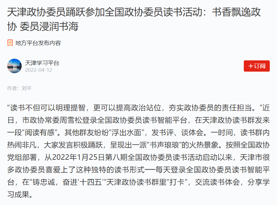 “讀書(shū)不但可以明理提智,更可以提高政治站位,夯實(shí)政協(xié)委員的責(zé)任擔(dān)當(dāng)。”近日,市政協(xié)常委周雪松登錄全國(guó)政協(xié)委員讀書(shū)智能平臺(tái),在天津政協(xié)讀書(shū)群發(fā)來(lái)一段“閱讀有感”。其他群友紛紛“浮出水面”,發(fā)書(shū)評(píng)、談體會(huì)。一時(shí)間,讀書(shū)群內(nèi)熱鬧非凡,大家發(fā)言積極踴躍,呈現(xiàn)出一派“書(shū)聲瑯瑯”的火熱景象。按照全國(guó)政協(xié)黨組部署,從2022年1月25日第八期全國(guó)政協(xié)委員讀書(shū)活動(dòng)啟動(dòng)以來(lái),天津市很多政協(xié)委員喜愛(ài)上了這種獨(dú)特的讀書(shū)形式──每天登錄全國(guó)政協(xié)委員讀書(shū)智能平臺(tái),在“鑄忠誠(chéng),奮進(jìn)‘十四五’”天津政協(xié)讀書(shū)群里“打卡”,交流讀書(shū)體會(huì),分享學(xué)習(xí)成果。