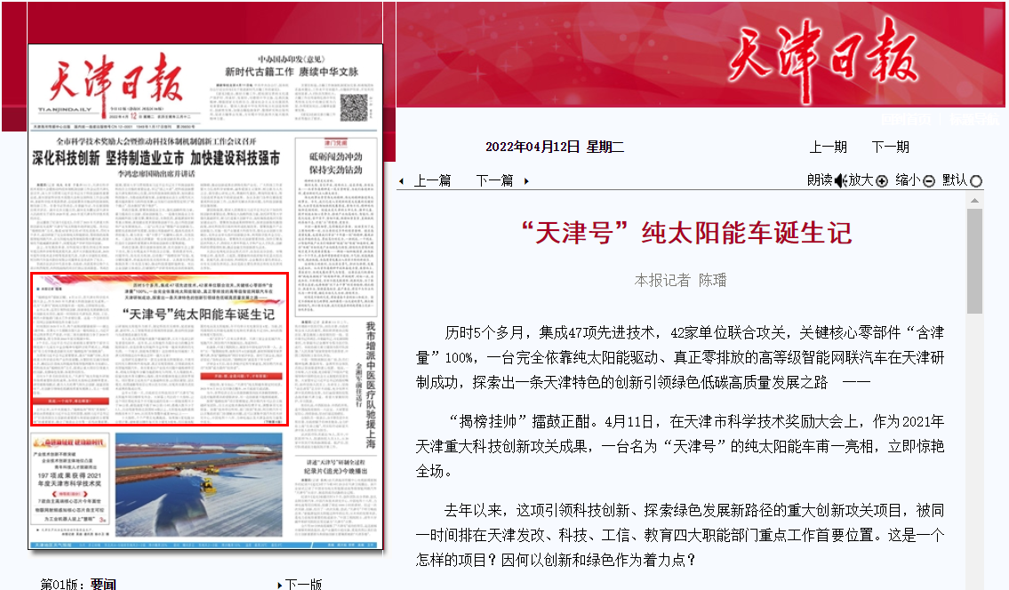 “任何一個產業的發展,一方面要抓住當前,穩住運行底盤,另一方面更要下好‘先手棋’。通過這次‘天津號’純太陽能車的研發,體現了天津在汽車行業方面要率先突破關鍵核心技術,率先在國內形成標桿,率先在未來產業技術上搶占先機。”市工業和信息化局副局長周勝昔說。