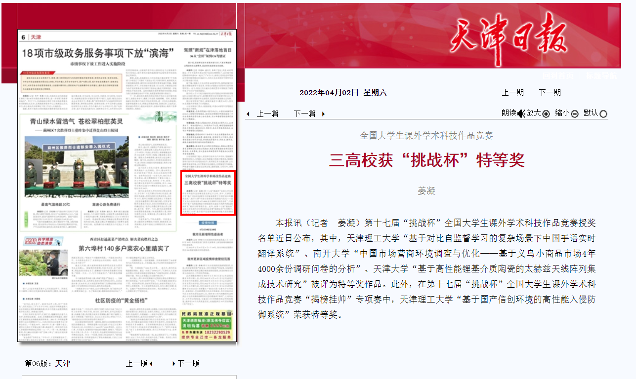 第十七屆“挑戰杯”全國大學生課外學術科技作品競賽授獎名單近日公布,其中,天津理工大學“基于對比自監督學習的復雜場景下中國手語實時翻譯系統”、南開大學“中國市場營商環境調查與優化──基于義烏小商品市場4年4000余份調研問卷的分析”、天津大學“基于高性能鋰基介質陶瓷的太赫茲天線陣列集成技術研究”被評為特等獎作品。此外,在第十七屆“挑戰杯”全國大學生課外學術科技作品競賽“揭榜掛帥”專項賽中,天津理工大學“基于國產信創環境的高性能入侵防御系統”榮獲特等獎。