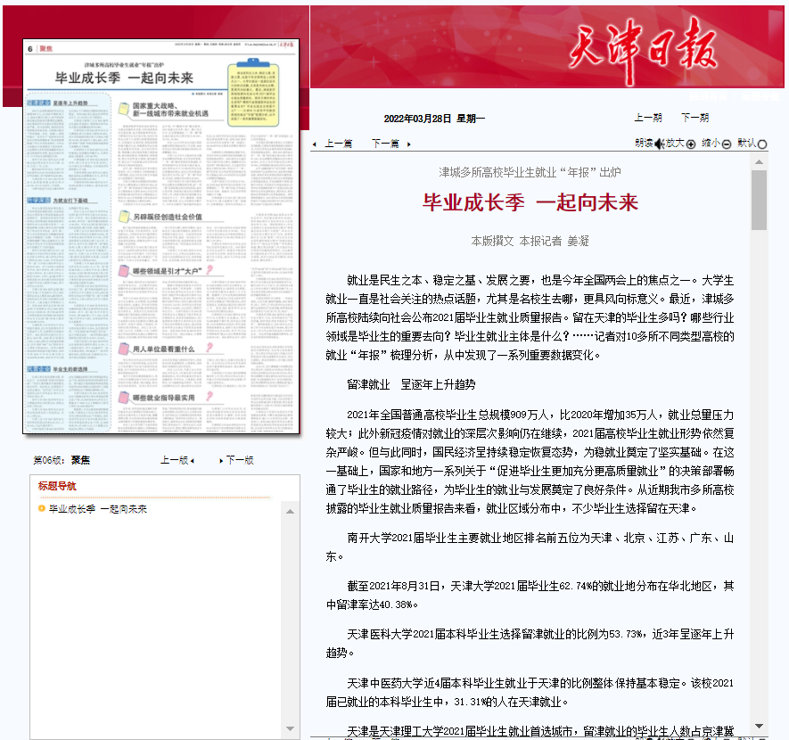 2021年全國普通高校畢業(yè)生總規(guī)模909萬人,比2020年增加35萬人,就業(yè)總量壓力較大;此外新冠疫情對就業(yè)的深層次影響仍在繼續(xù),2021屆高校畢業(yè)生就業(yè)形勢依然復(fù)雜嚴峻。但與此同時,國民經(jīng)濟呈持續(xù)穩(wěn)定恢復(fù)態(tài)勢,為穩(wěn)就業(yè)奠定了堅實基礎(chǔ)。在這一基礎(chǔ)上,國家和地方一系列關(guān)于“促進畢業(yè)生更加充分更高質(zhì)量就業(yè)”的決策部署暢通了畢業(yè)生的就業(yè)路徑,為畢業(yè)生的就業(yè)與發(fā)展奠定了良好條件。從近期我市多所高校披露的畢業(yè)生就業(yè)質(zhì)量報告來看,就業(yè)區(qū)域分布中,不少畢業(yè)生選擇留在天津。