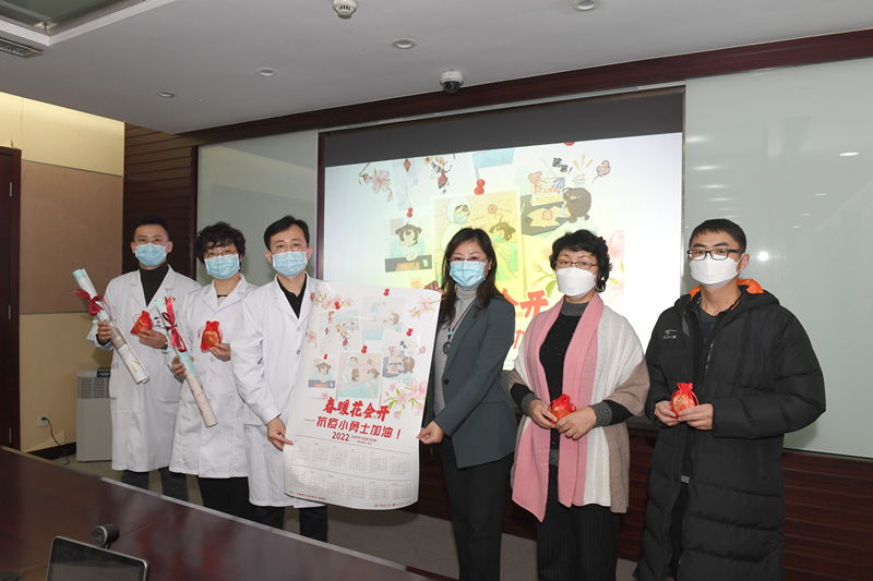 漫畫在網上發表后,引發眾多轉載、點贊。“一中心醫院的相關負責人聯系我們,說看到后非常感動。我們就想,恰逢農歷小年,不如把學生創作的藝術作品制成年歷,作為禮物送給這些孩子們?!碧旖蚶砉ご髮W宣傳部部長劉迎告訴記者,他們根據學生的漫畫,于1月24日連夜趕制出百余份“春暖花會開,抗疫小勇士加油!”主題的2022年年歷。昨天下午5時,天津理工大學將這些年歷以及用福袋包好的糖瓜,送給每個在一中心醫院水西院區康復治療和健康監測的小朋友們。