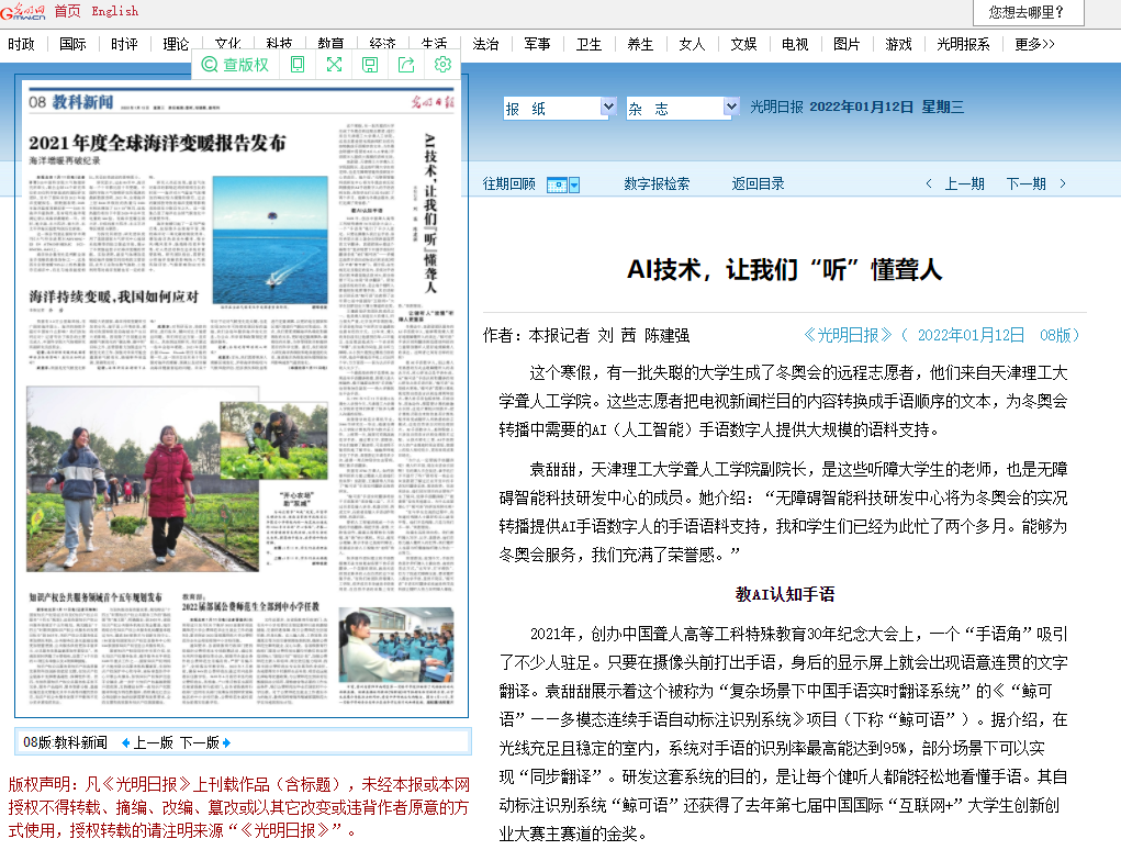 這個寒假,有一批失聰的大學生成了冬奧會的遠程志愿者,他們來自天津理工大學聾人工學院。這些志愿者把電視新聞欄目的內容轉換成手語順序的文本,為冬奧會轉播中需要的AI(人工智能)手語數字人提供大規模的語料支持。