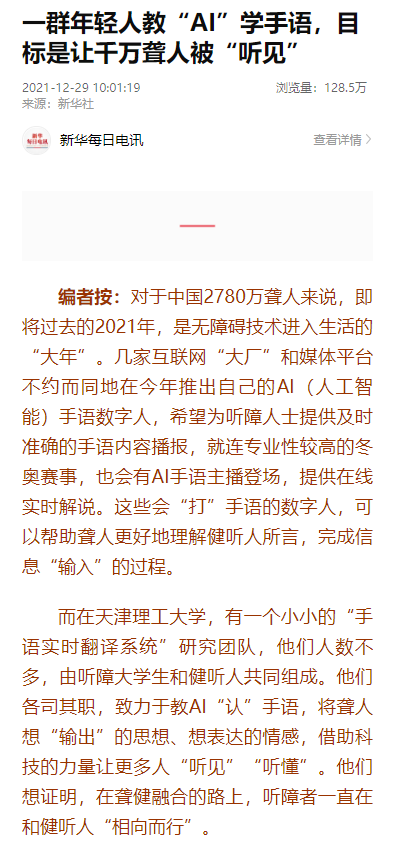對于袁甜甜和她的團隊來說,2019年和2021年是兩個關鍵的時間節點。2019年,是他們的初創之年,“手語實時翻譯系統”入選國家工信部新一代人工智能產業創新揭榜項目,獲得了2000萬的資金支持。袁甜甜很高興,一方面是因為國家對無障礙建設的重視讓她欣慰,另一方面,數據采集、技術研發、成果落地也確實是處處都要花錢。