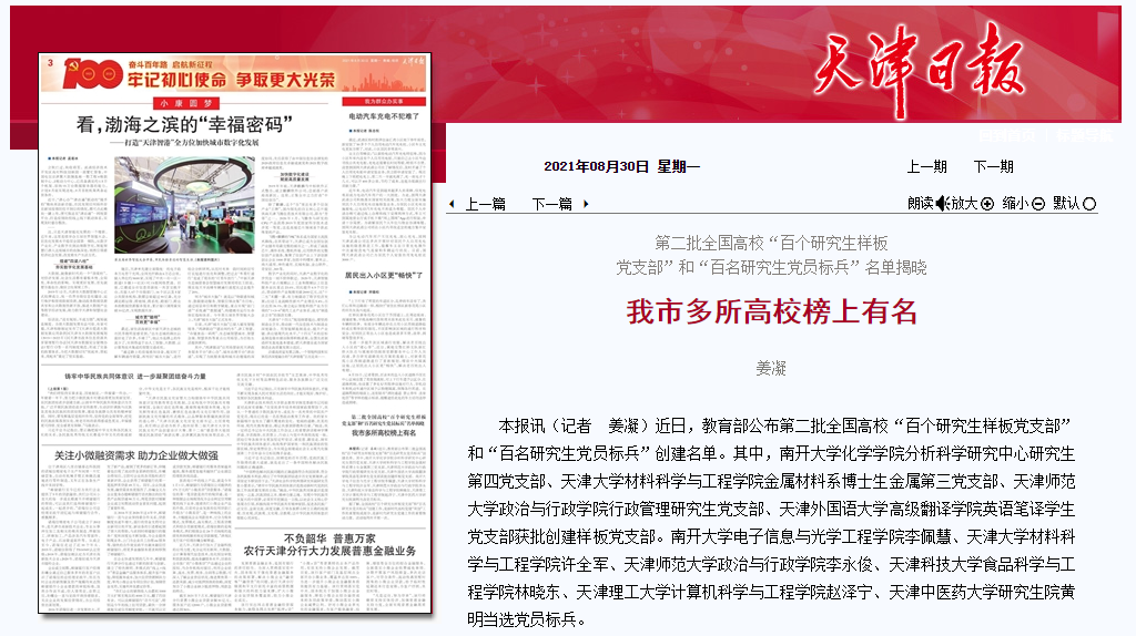 近日,教育部公布第二批全國高校“百個研究生樣板黨支部”和“百名研究生黨員標(biāo)兵”創(chuàng)建名單。其中,南開大學(xué)化學(xué)學(xué)院分析科學(xué)研究中心研究生第四黨支部、天津大學(xué)材料科學(xué)與工程學(xué)院金屬材料系博士生金屬第三黨支部、天津師范大學(xué)政治與行政學(xué)院行政管理研究生黨支部、天津外國語大學(xué)高級翻譯學(xué)院英語筆譯學(xué)生黨支部獲批創(chuàng)建樣板黨支部。南開大學(xué)電子信息與光學(xué)工程學(xué)院李佩慧、天津大學(xué)材料科學(xué)與工程學(xué)院許全軍、天津師范大學(xué)政治與行政學(xué)院李永俊、天津科技大學(xué)食品科學(xué)與工程學(xué)院林曉東、天津理工大學(xué)計算機(jī)科學(xué)與工程學(xué)院趙澤寧、天津中醫(yī)藥大學(xué)研究生院黃明當(dāng)選黨員標(biāo)兵。