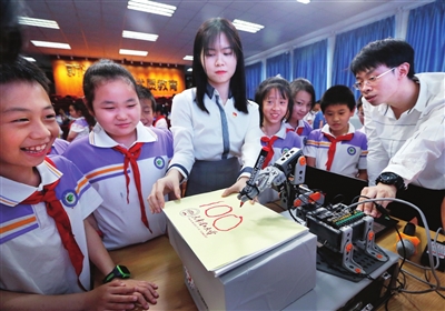24日,天津理工大學機械工程學院機器人教本研黨支部師生結合自身專業特點,來到南開區風湖里小學開展機器人科普活動。圖為大學生為小學生演示自己設計制作的機械手臂書寫“100”字樣。