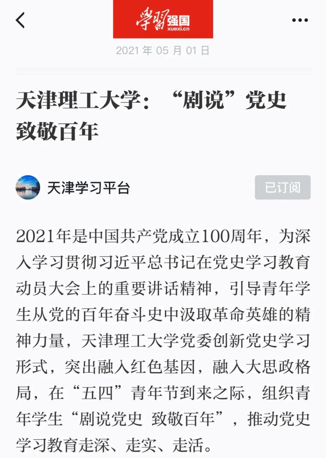 為深入學習貫徹習近平總書記在黨史學習教育動員大會上的重要講話精神,引導青年學生從黨的百年奮斗史中汲取革命英雄的精神力量,天津理工大學黨委創新黨史學習形式,突出融入紅色基因,融入大思政格局,在“五四”青年節到來之際,組織青年學生“劇說黨史 致敬百年”,推動黨史學習教育走深、走實、走活。《學習強國》刊發了活動情況,全文如下: