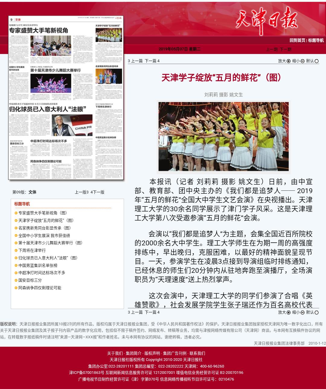 日前,由中宣部、教育部、團(tuán)中央主辦的《我們都是追夢(mèng)人── 2019年“五月的鮮花”全國(guó)大中學(xué)生文藝會(huì)演》在央視播出。天津理工大學(xué)的30余名同學(xué)展示了津門學(xué)子風(fēng)采。這是天津理工大學(xué)第八次受邀參演“五月的鮮花”會(huì)演。